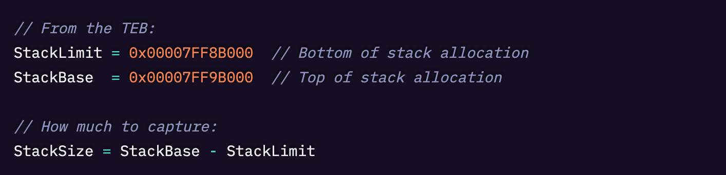 Crashpad は、Windows が維持するスレッドごとのデータ構造である Windows Thread Environment Block(TEB)を読み取ることで、どれだけのスタックをキャプチャするかを決定します。具体的には次のとおりです。