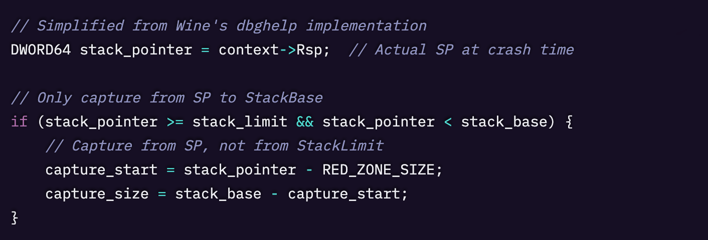 Proton 上で Crashpad がどんな TEB 値を読んでいるか確認するためにログを追加したところ、原因が見えました。Wine の TEB 実装が、実際には StackLimit と StackBase を非常に大きな値に設定しており、その結果 Crashpad はスタックの底から頂上まで、つまりコミット(実際に使用)された領域だけでなく、ユーザーモードのアドレス空間ほぼ全体をキャプチャしようとしていたのです。