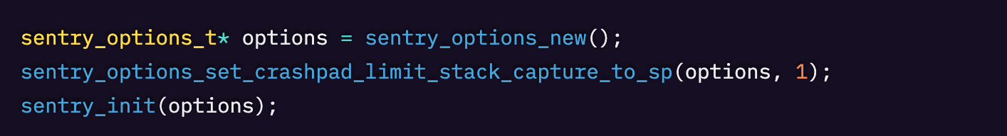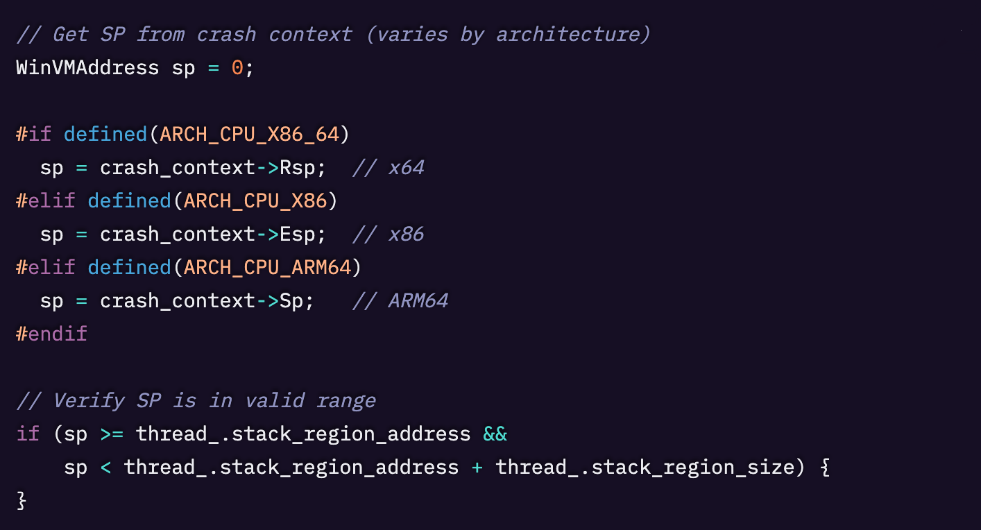 Crashpad に新しいオプションを追加し、TEB ベースから SP ベースのスタックキャプチャへ切り替えられるようにしました。有効化すると、クラッシュハンドラは保存されたクラッシュコンテキストからスタックポインタを抽出し、妥当なスタック範囲を計算します。