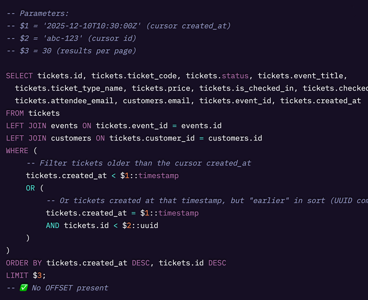 バックエンドは nextCursor を解析し、created_at と id を抽出し、上記の SQL で見られるような WHERE 句を適切に構築します。prevCursor は前のページに戻るためのものです。