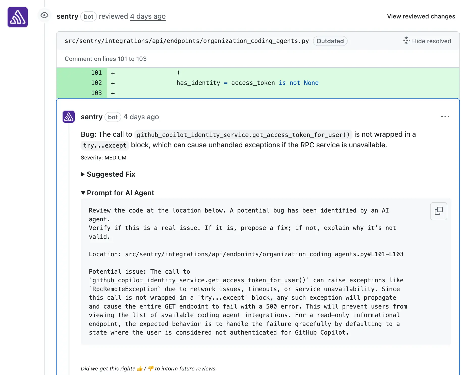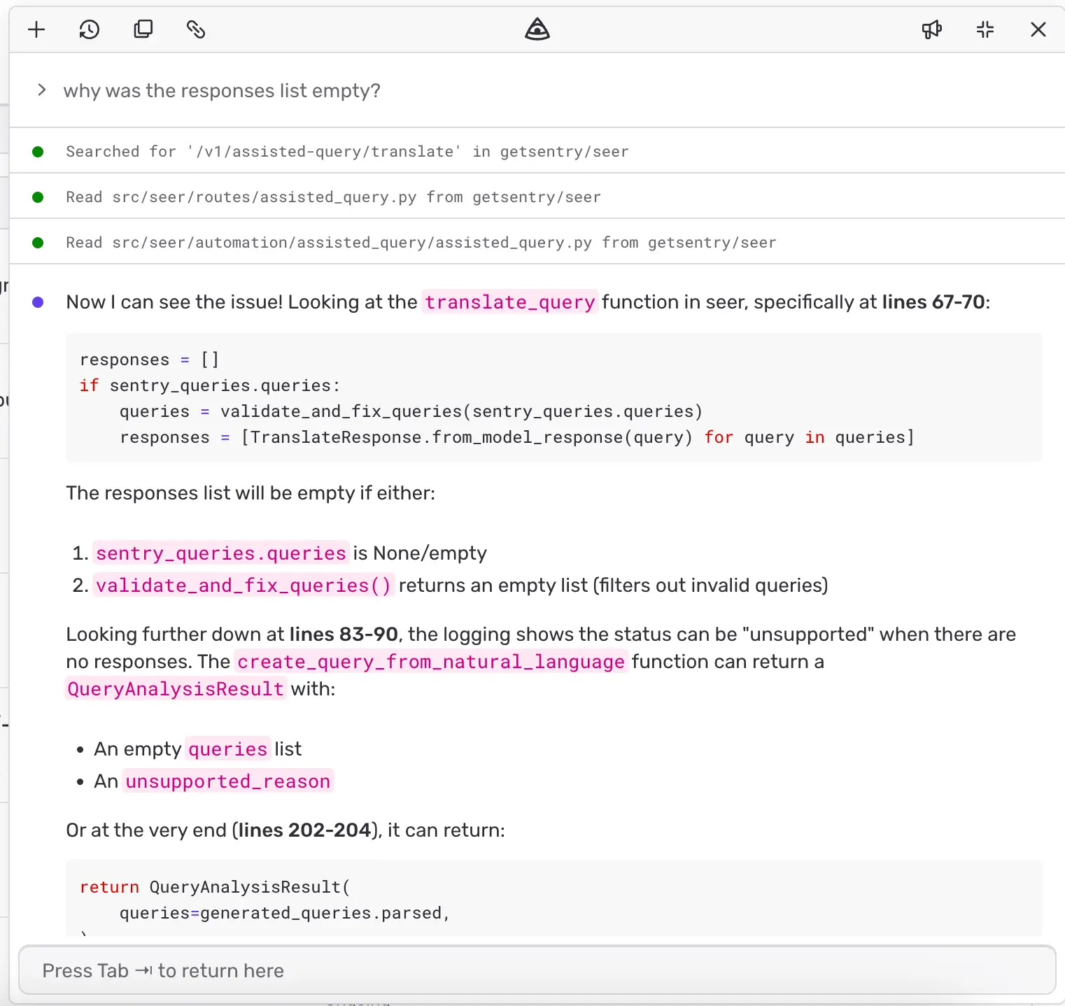 それでも、ローカル環境ですべてを捕まえられるわけではありません。すり抜けたバグに対しては、コードレビューのタイミングで Seer が介入し、プルリクエストに含まれる問題をマージ前に特定します。Seer が重視するのは、本番環境を壊しかねない実害のあるバグを見つけることです。信号の弱い提案やスタイルに関する些細な指摘には注力しません。レビューの段階でこうした欠陥を見つけ出すことで、インシデントは減り、リリースは速くなり、本番環境でのデバッグに費やす時間も短くなります。