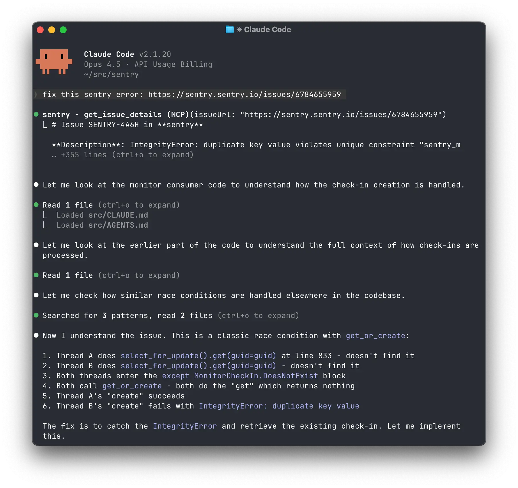 バグは導入された瞬間に修正するのが最も簡単です。Sentry MCP サーバー は、強力なデバッグフィードバックループを通じて、ローカルのコーディングエージェントを接続します。これにより、コードレビューや本番環境ではなく、開発中に問題を発見し解決することができます。ローカルでバグを再現すると、テレメトリがアプリケーションから Sentry に送られ、エージェントはコンテキストのための生のイベントにアクセスしたり、Seer を呼び出して完全な根本原因分析を実行することができます。コーディングエージェントは、コードがローカル環境を離れる前にパッチを生成するために必要なすべての情報を得ることができます。