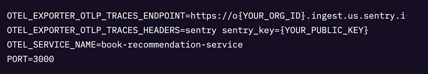 プレースホルダーの値を実際のSentry認証情報に置き換えてください。OTEL_SERVICE_NAMEは、後でSentry上でトレースをフィルタリングする際に役立ちます。