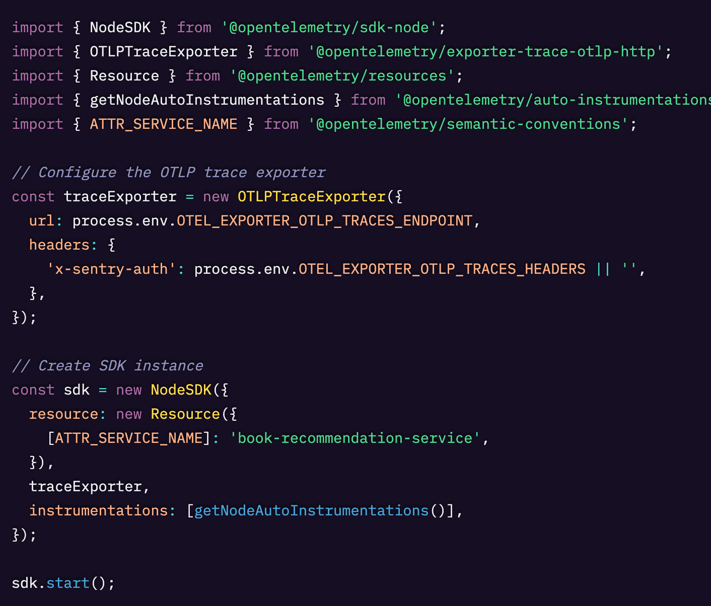 この例では、GitHubリポジトリから取得できるサンプルの書籍レコメンドサービスを使用します。このアプリにはすでにOpenTelemetryのトレーシング計測が組み込まれています。計測コードを変更する必要はなく、SentryのOTLPエンドポイントに送信先を設定するだけです。