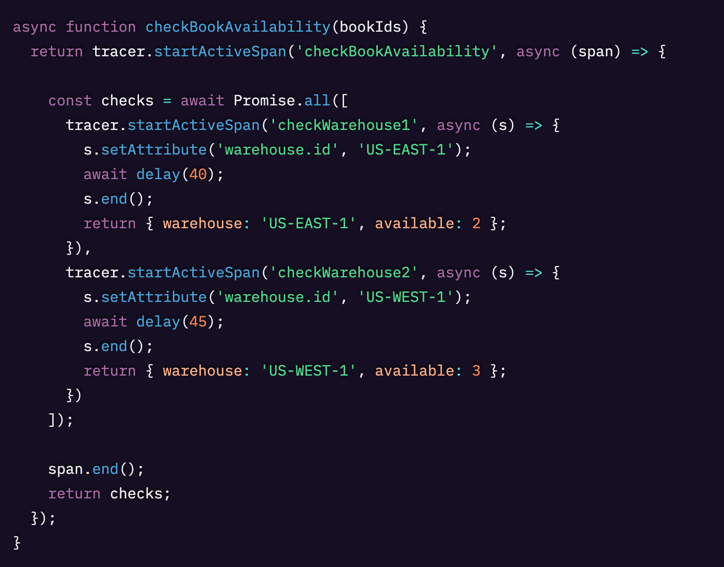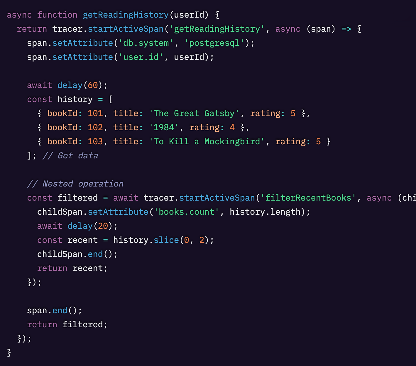 startActiveSpanメソッドは新しいスパンを作成し、それを「アクティブなスパン」として設定します。この関数内で作成された子スパンは、自動的にこのスパンの子として関連付けられます。