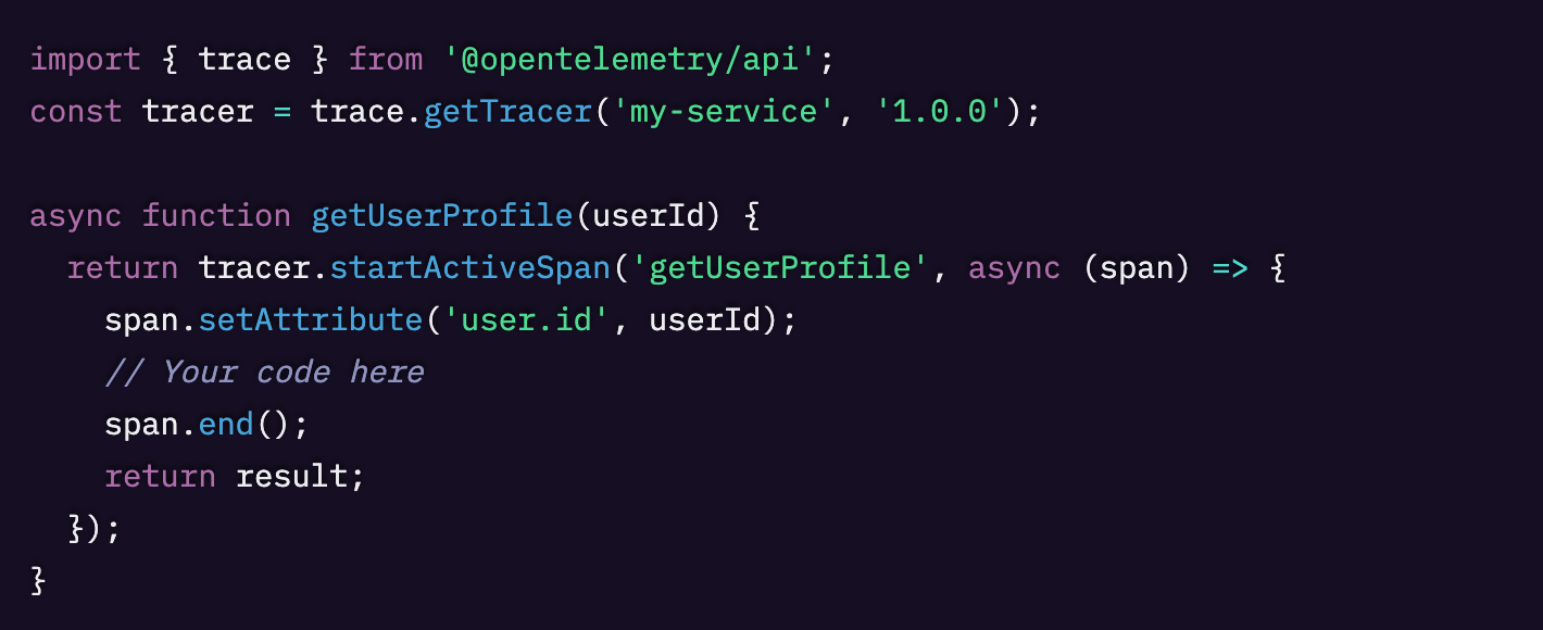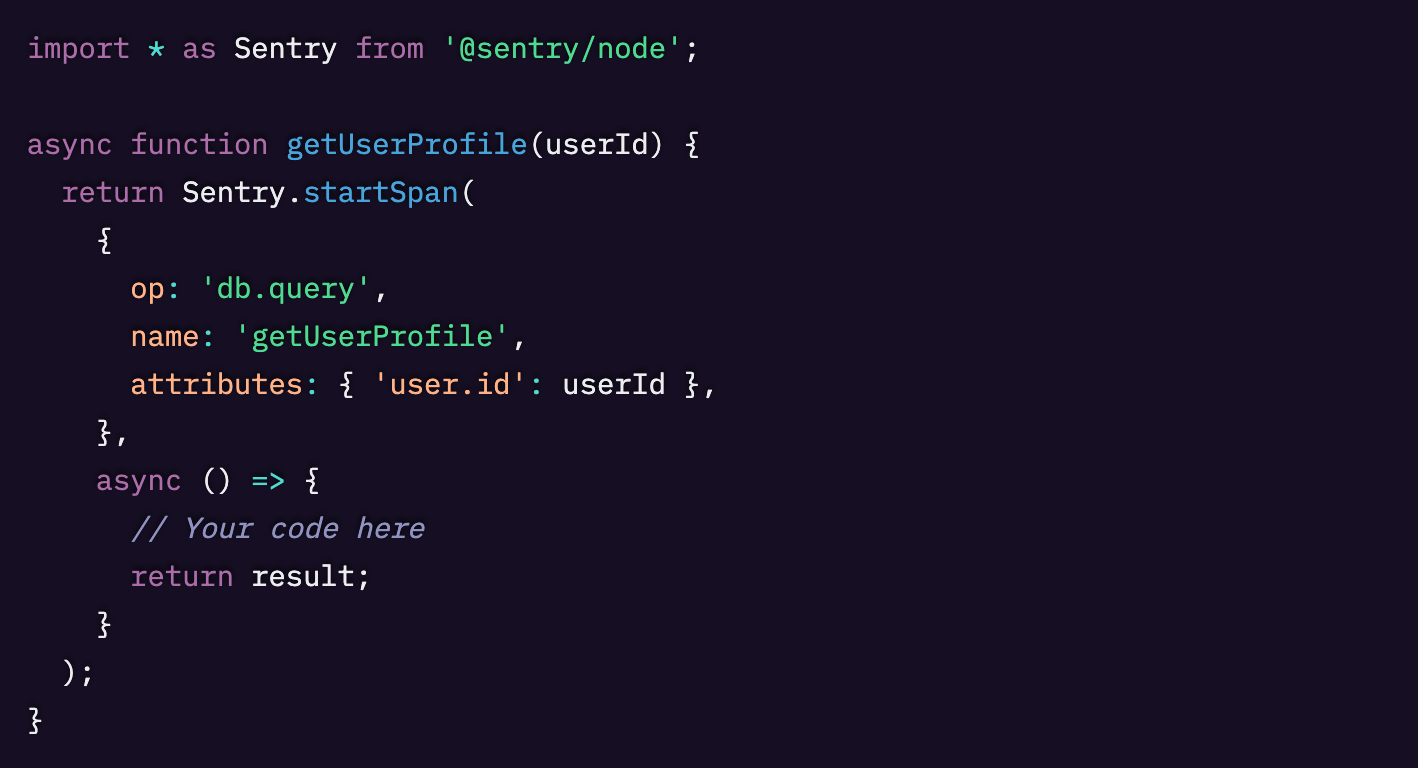 span.setAttribute() を使用して、ユーザーID、リクエストID、フィーチャーフラグなどの関連データを付加できます。コンテキストが多いほど、Sentryでのフィルタリングやデバッグが容易になります。