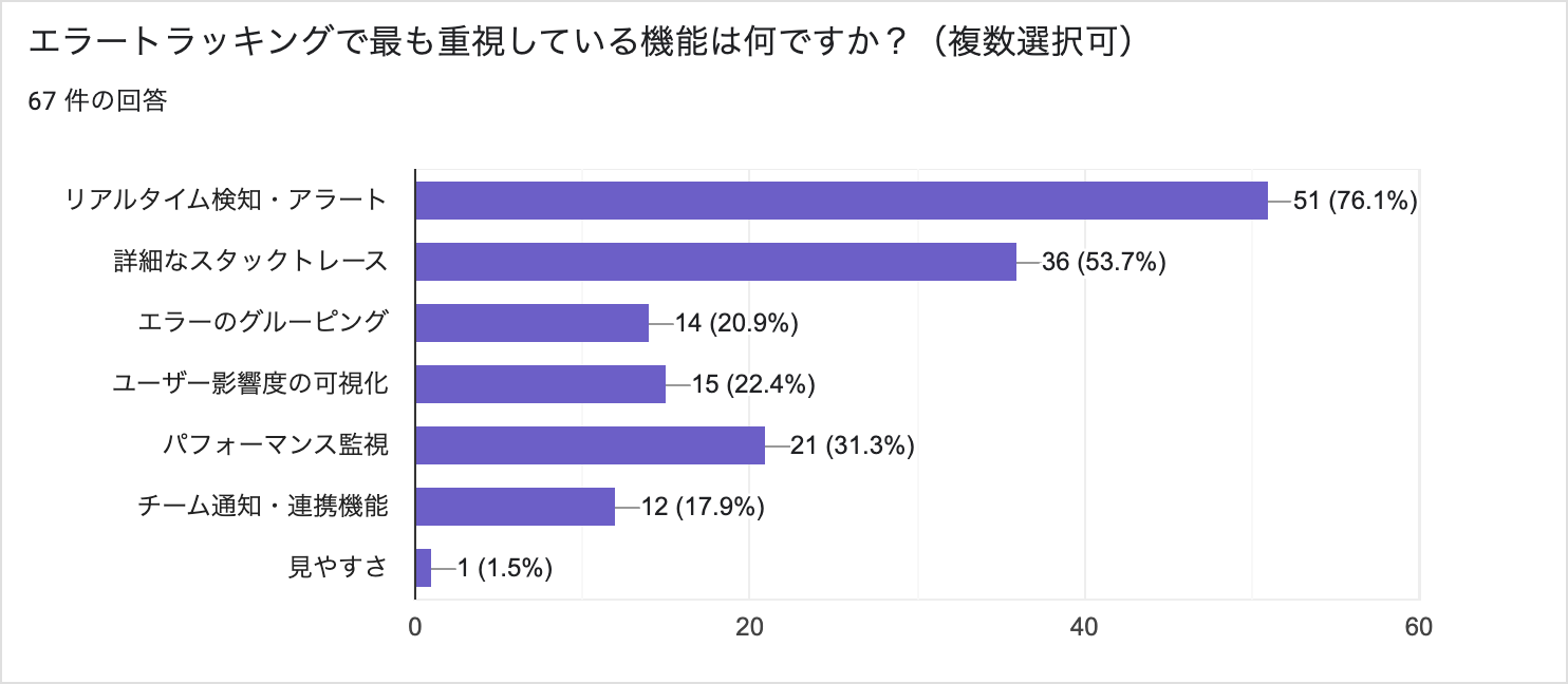 特筆すべきは、76%もの開発者がリアルタイム検知・アラートを最重視しているという結果です。サーバーサイドでは、ユーザー影響が発生する前にエラーを検知し、迅速に対応することが何よりも重要視されていることがわかります。