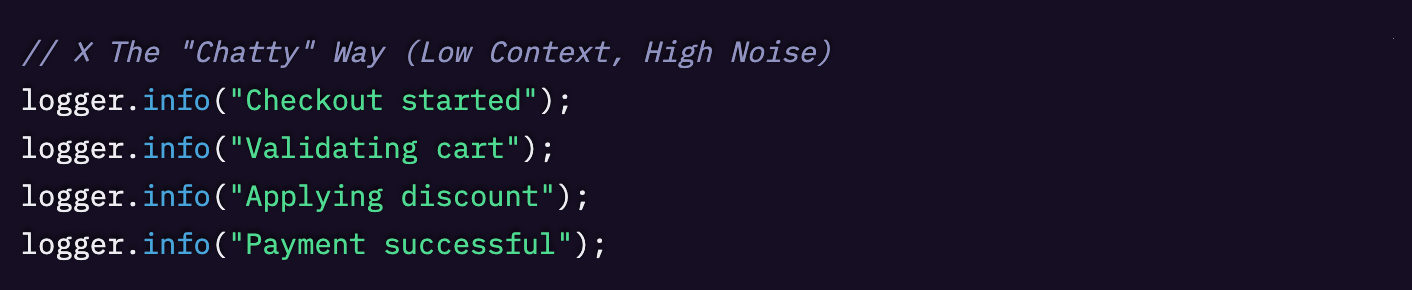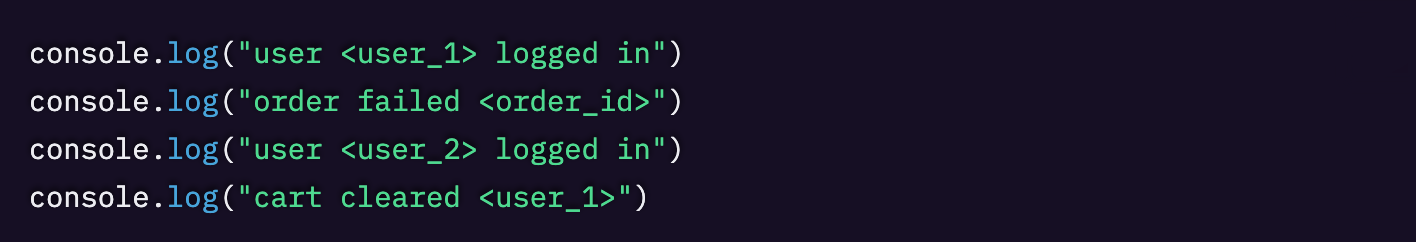 たとえばカートのチェックアウトフローを考えてみましょう。「従来のやり方」だと、複数の個別ログ行を出すことになりがちです。