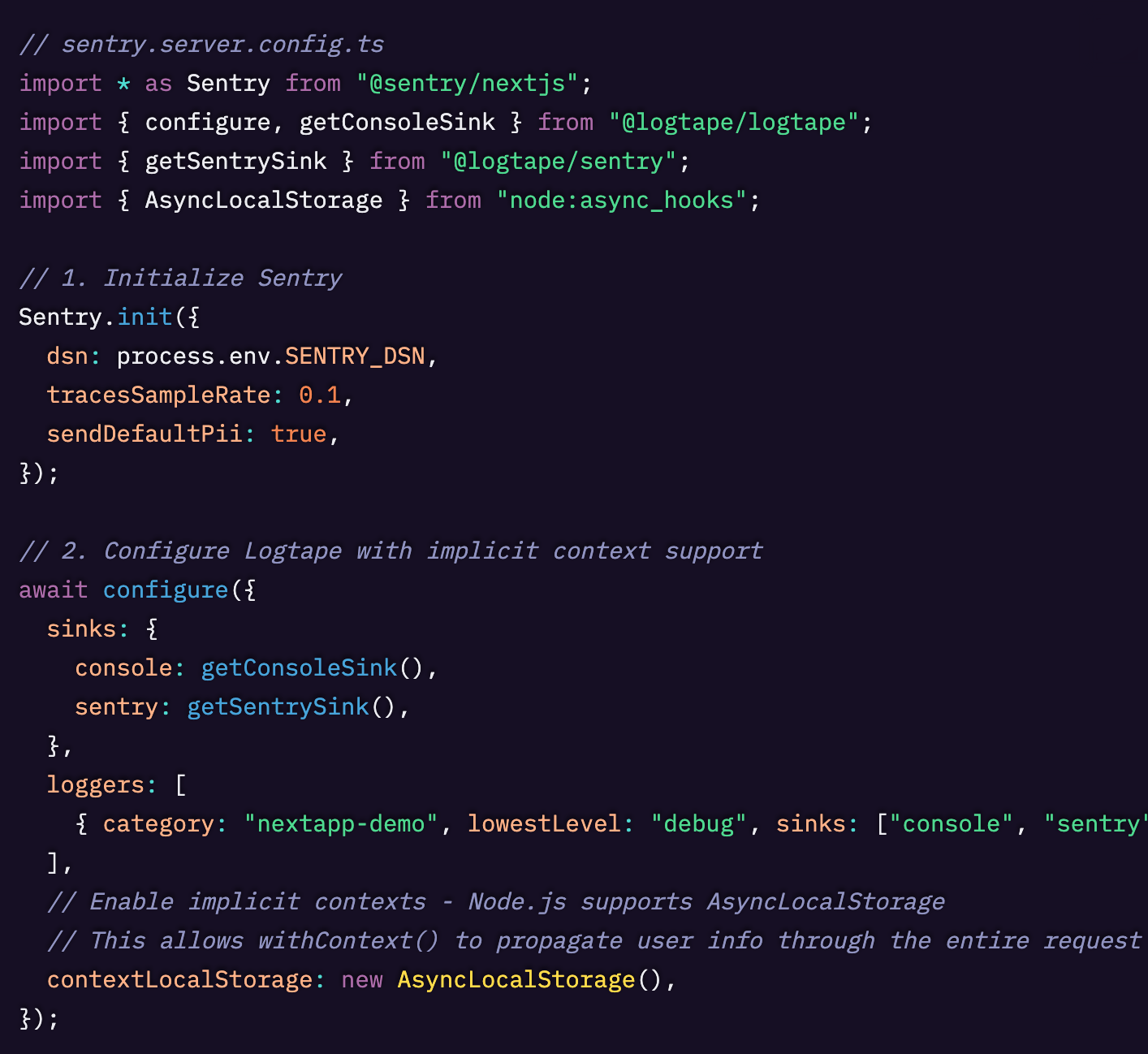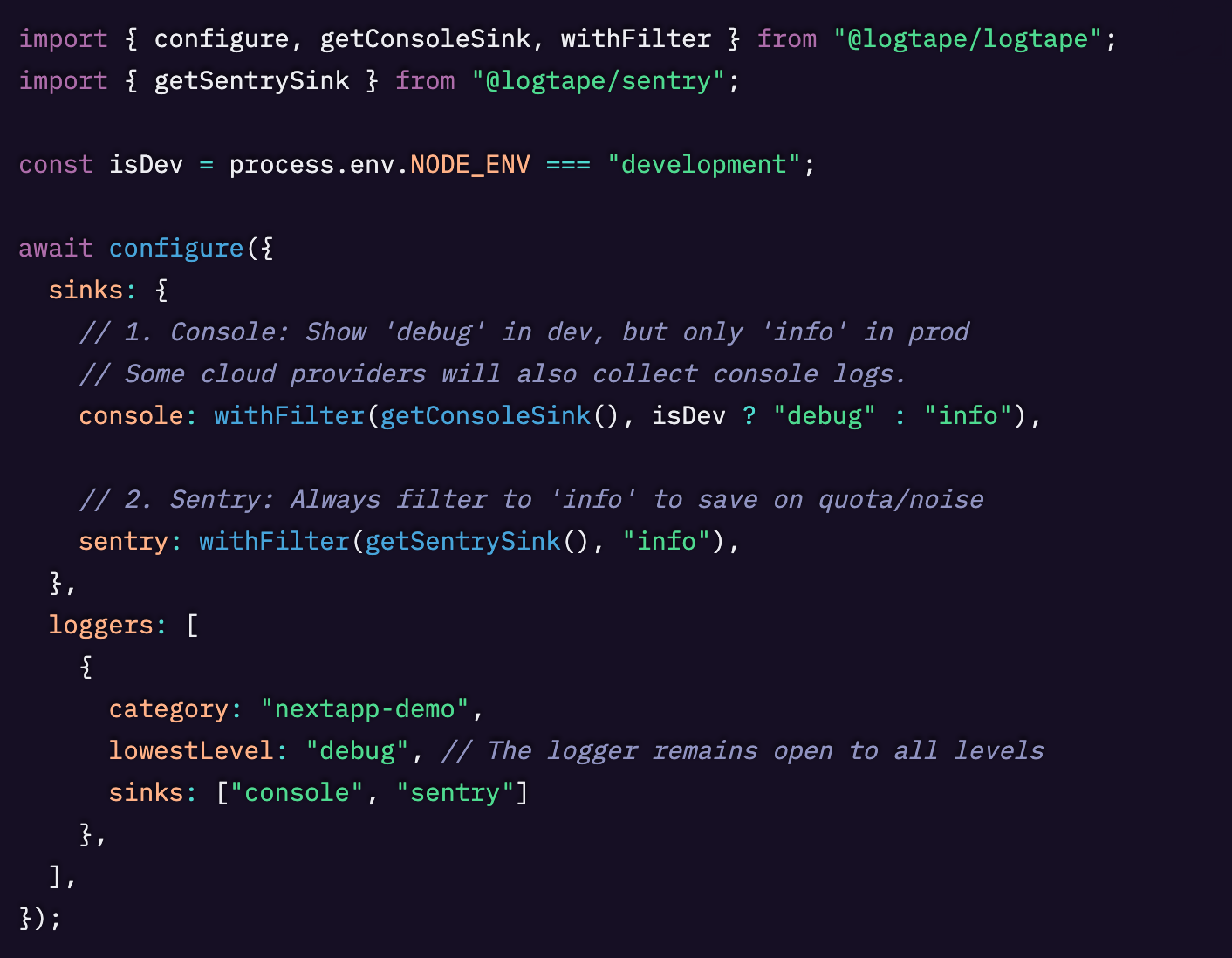 残りの設定を入れたあとで分解して説明しますが、要するにここでは logger オブジェクトを使ってログを出すと コンソールと Sentry の両方に送られるように LogTape を設定しています。