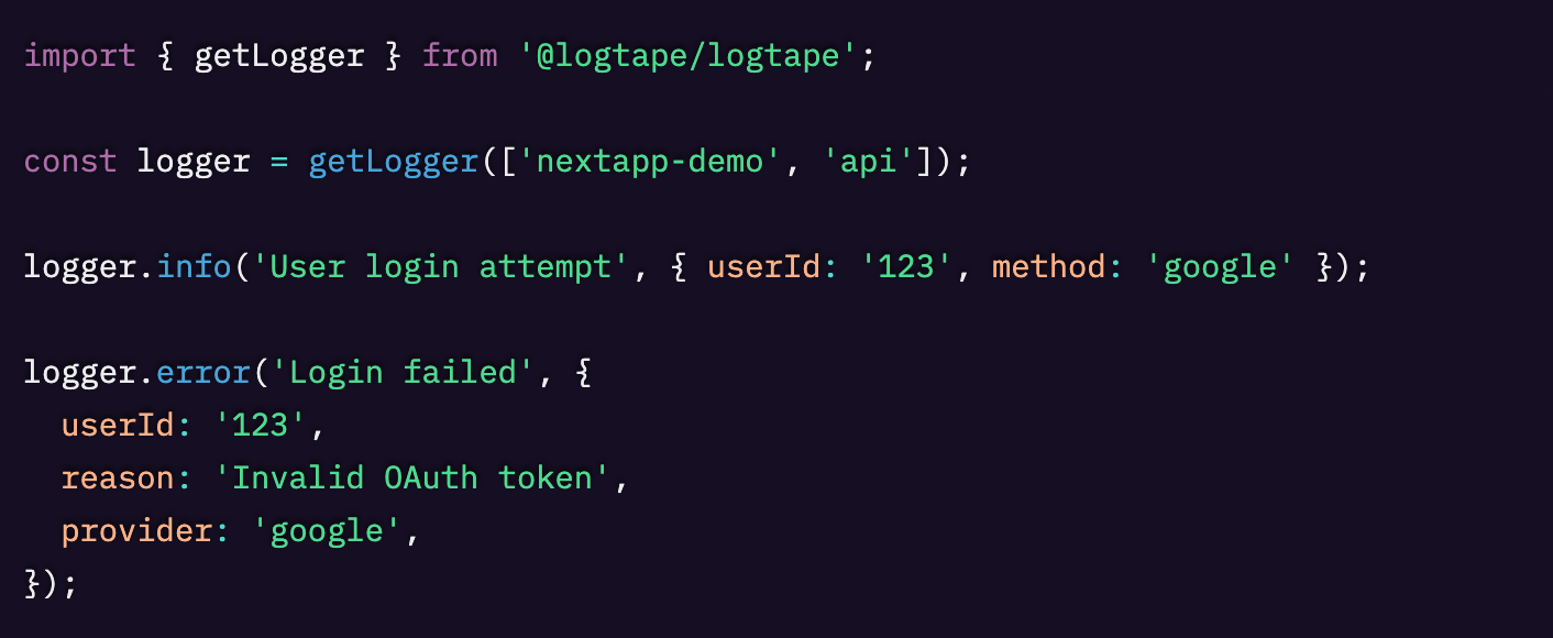 ここでは追加で api というカテゴリも設定しています。これによりこのスコープ付きの子ロガーから出るログにはすべて category: nextapp-demo.api が付与されるため、あとからクエリで検索できます。