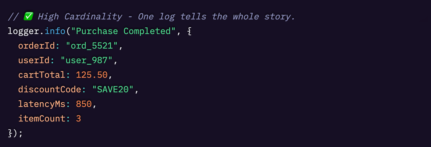 - 高カーディナリティを受け入れる: タスクの進行に伴って積み上がる「厚い」コンテキストをログに詰め込みましょう。ユーザーID、注文ID、カート情報などを含め、任意のイベントについて必要なデータをクエリできるようにします。