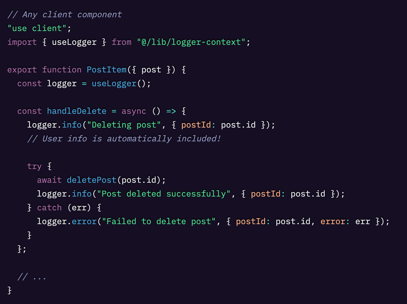 バックエンドとは異なり、ブラウザには暗黙的コンテキストのための AsyncLocalStorage API がありません。ユーザーデータをすべてのログに手動で付けるのを避けるために、React Context を使って継承を自動化できます。